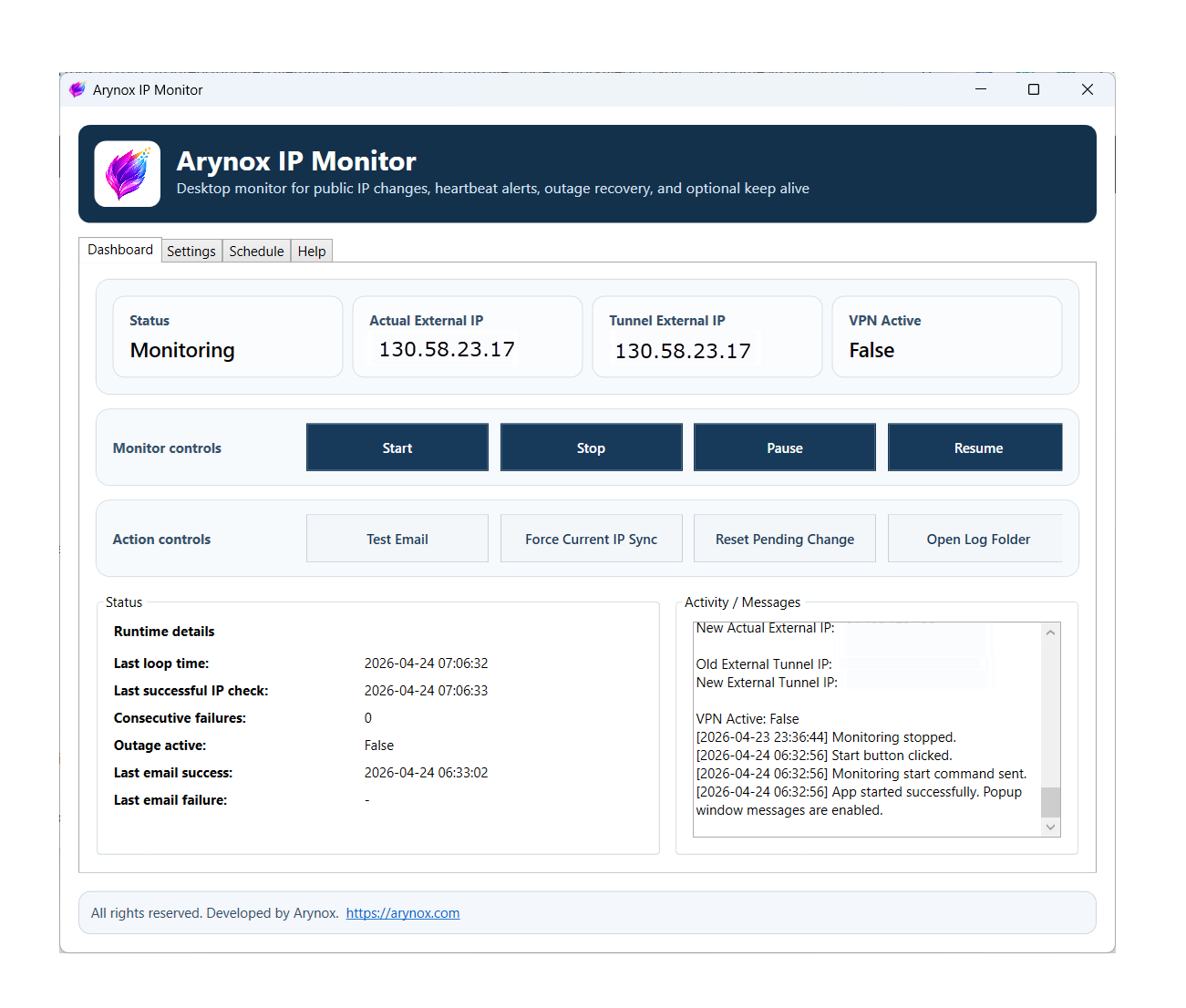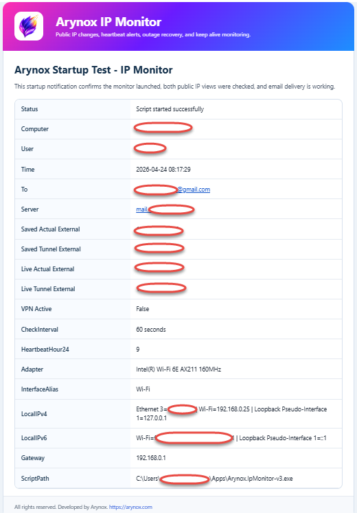 Whether you need dependable IP tracking for home, remote work, VPN use, or technical administration, Arynox IP Monitor gives you a simple and professional way to stay aware of network changes.